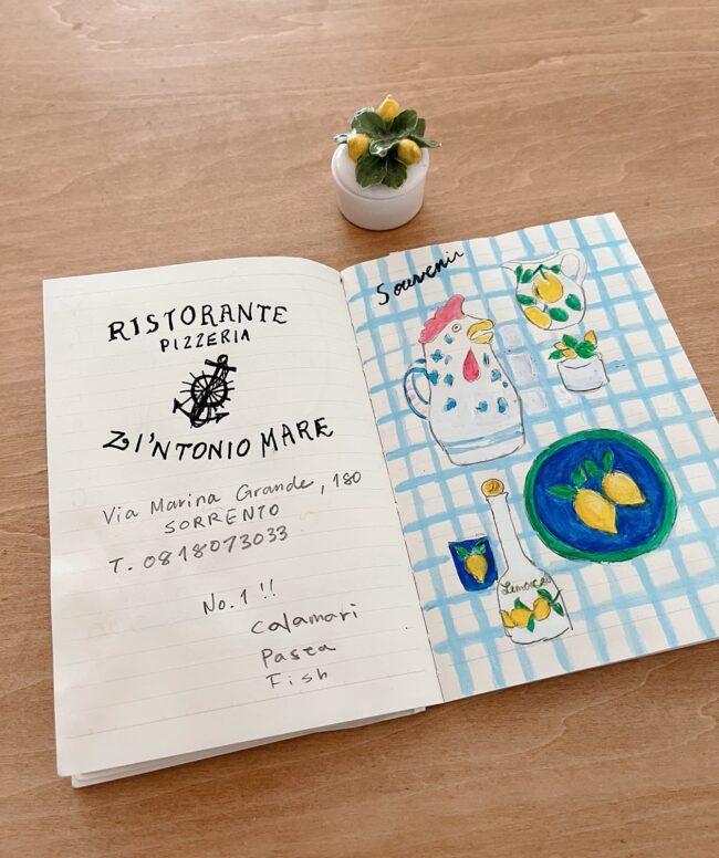 ヨーロッパの鉄道の仕事をしていた父の影響で、旅ノートを付け始めたという。「旅で集まったレシートを束ねておくだけでもいろいろな情報が詰まっているから」と勧められたが、それだけではつまらないと、ショップカードを貼ったり、印象に残った景色や、購入したものの絵を描いたり、訪れた店や家族との写真を添えたり。時刻表やお店の感想、食べたもの、これから行ってみたいところなども記されている。この旅ノートは今もずっと続けている習慣だ。