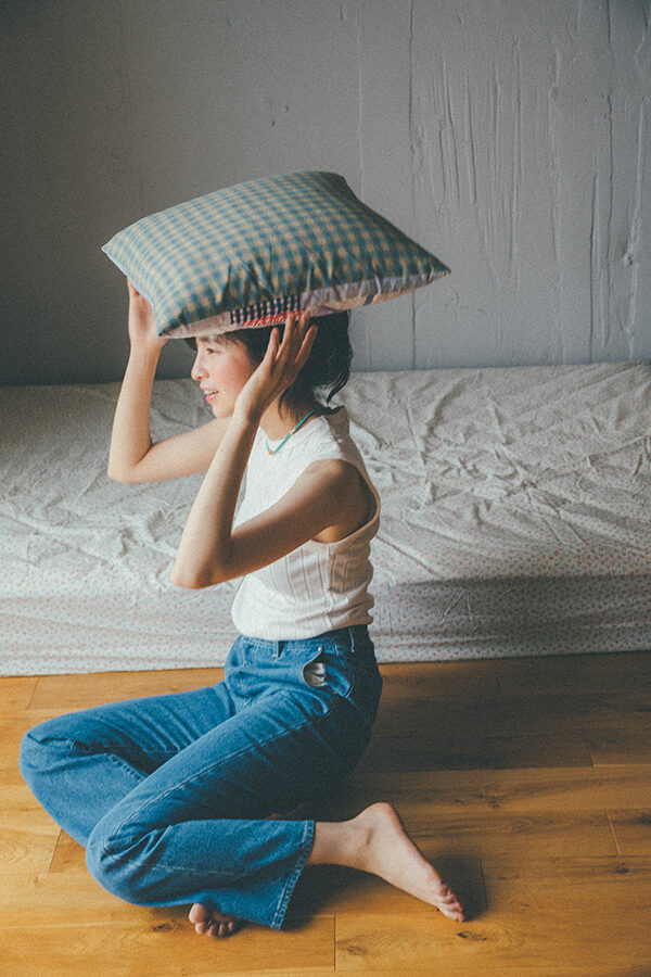 スウェットトップス¥19,800、スウェットパンツ¥24,200/ともにUpcycle、キャップ¥6,380/Bluescentric、クッション 参考商品/INDIVIDUALIZED SHIRTS(以上メイデン・カンパニー 03-5410-9777)、イヤリング各11,000/atelier ST, CAT(アトリエ エスティーキャット atelier ST, CAT)、ソックス¥2,640/American Trench(ユーソニアン グッズ ストア )